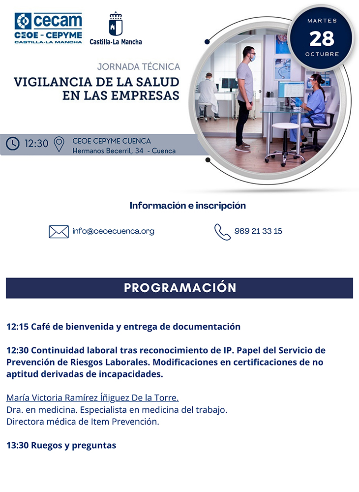 La Confederación de Empresarios de Cuenca convoca a sus asociados a analizar en una jornada técnica la ‘Vigilancia de la Salud en las empresas’ el próximo martes 28 de octubre.