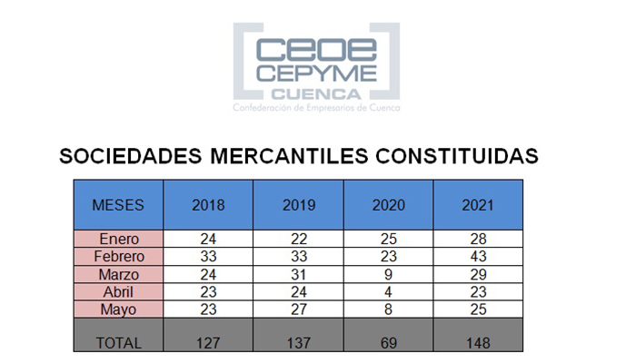 La Confederación de Empresarios de Cuenca indica que los datos de sociedades mercantiles que publica el INE indican un aumento superior al 100% respecto al año pasado y también se superan los datos de 2019 y 2018 en los cinco primeros meses del año.