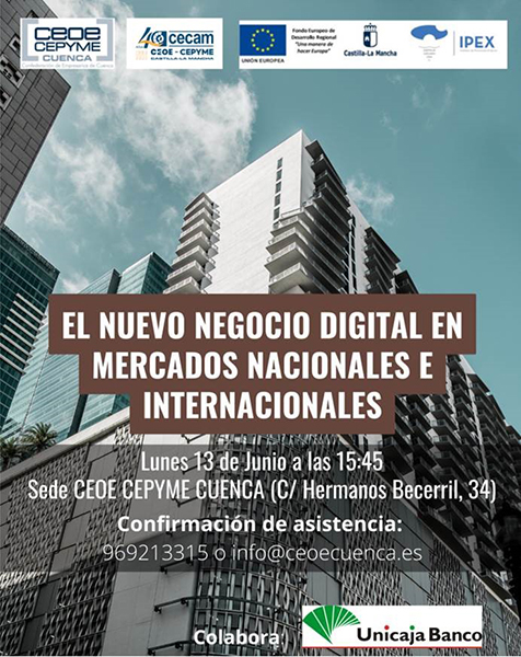 La jornada que tendrá lugar el día 13 a partir de las 15.45 horas en la sede de CEOE CEPYME Cuenca, en la calle Hermanos Becerril 34 está titulada ‘El nuevo negocio digital en mercados nacionales e internacionales’.