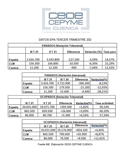 CEOE CEPYME Cuenca señala que los datos de ocupación que indica la EPA del tercer trimestre de 2021 también son positivos con un incremento de 5.300 ocupados en de julio septiembre, incrementándose un 6,56%, y alcanzando la tasa de actividad el 57,34%.