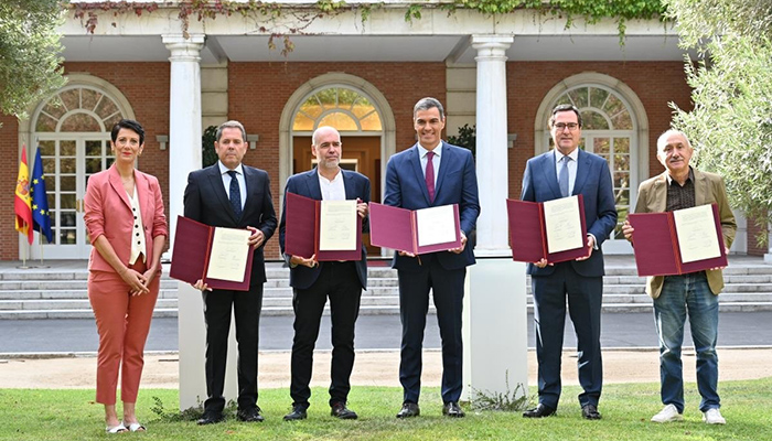 El acuerdo fue firmado por el presidente de CEOE, Antonio Garamendi, el de CEPYME, Gerardo Cuerva, el presidente del Gobierno, Pedro Sánchez, y los secretarios generales de Comisiones Obreras, Unai Sordo y UGT, Pepe Álvarez con la presidencia de la ministra de Inclusión, Seguridad Social y Migraciones, Elma Sáiz.