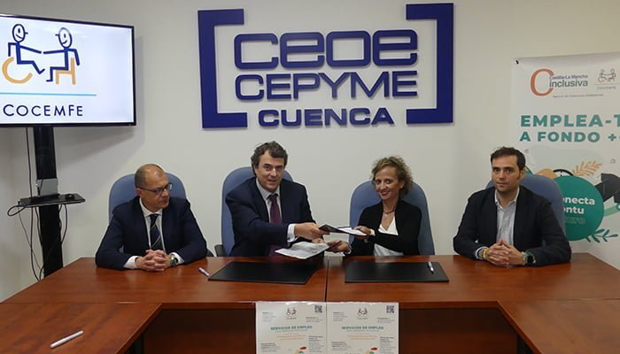 La Confederación de Empresarios de Cuenca, la Confederación Española de Personas con Discapacidad Física y Orgánica COCEMFE Y COCEMFE CUENCA, la Confederación de Entidades de personas con discapacidad física y orgánica CLM INCLUSIVA COCEMFE, han firmado un convenio de colaboración mediante el que se promoverá la activación, la mejora de la empleabilidad y el acceso al empleo de las personas con discapacidad.