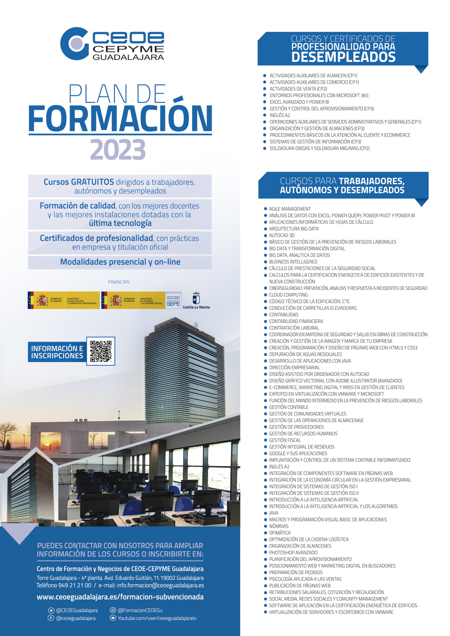 planformacion2023 a4 300pppEl departamento de Formación de CEOE-CEPYME Guadalajara, pone en marcha, durante los primeros días del año, 4 nuevos cursos de formación subvencionada tanto para trabajadores, desempleados y autónomos, de los más de 70 que tiene previsto impartir a lo largo de este 2023.