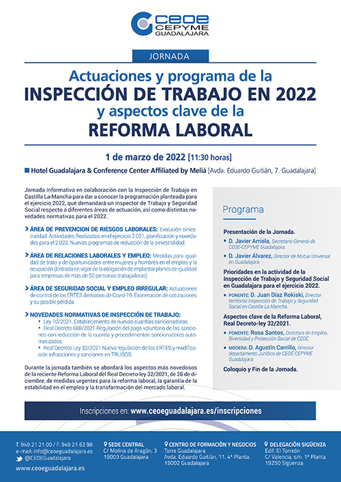 CEOE-CEPYME Guadalajara, en colaboración con Mutua Universal, ha organizado para el próximo 1 de marzo una nueva jornada informativa, en esta ocasión, centrada en las “Actuaciones y programa de la inspección de trabajo en 2022 y aspectos clave de la reforma laboral”. La jornada tendrá lugar en el hotel Guadalajara & conference center affiliated by Meliá, ubicado en la Avda. Eduardo Guitián, 7 a las 11:30 horas.