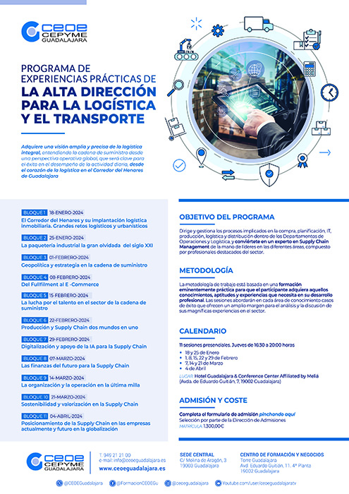 Un programa, organizado por CEOE-CEPYME Guadalajara, con la dirección de Fernando Herrera, asesor en Power & Glen Asociados y la coordinación de Javier Arriola, secretario general de CEOE-CEPYME Guadalajara, que tendrá un coste de 1.300€ y que está dirigido, principalmente a directores generales, consejeros delegados o directores de cualquier área de la cadena de suministro, así como para mandos intermedios, profesionales de operaciones, Project Managers, emprendedores o directores de talento y formación, entre otros.