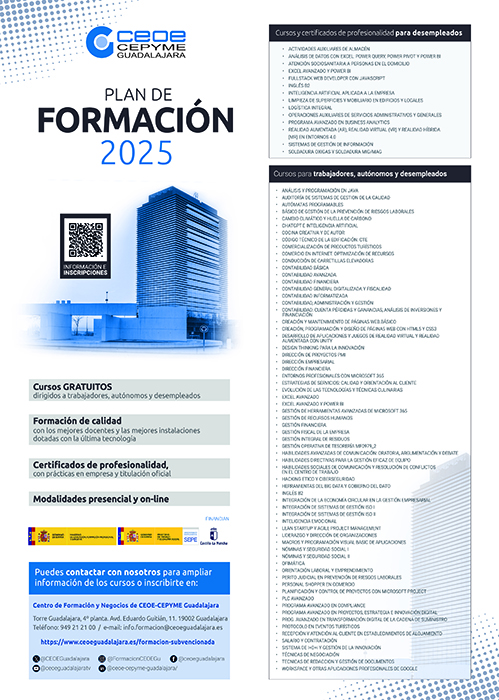 Cerca de 100 nuevos cursos conforman el plan de formación de la Confederación de empresarios de Guadalajara para 2025, cursos gratuitos que están financiados por la Junta de Comunidades de Castilla-La Mancha a través de los ministerios de Educación, Formación Profesional y Deportes y el de Trabajo y Economía Social.