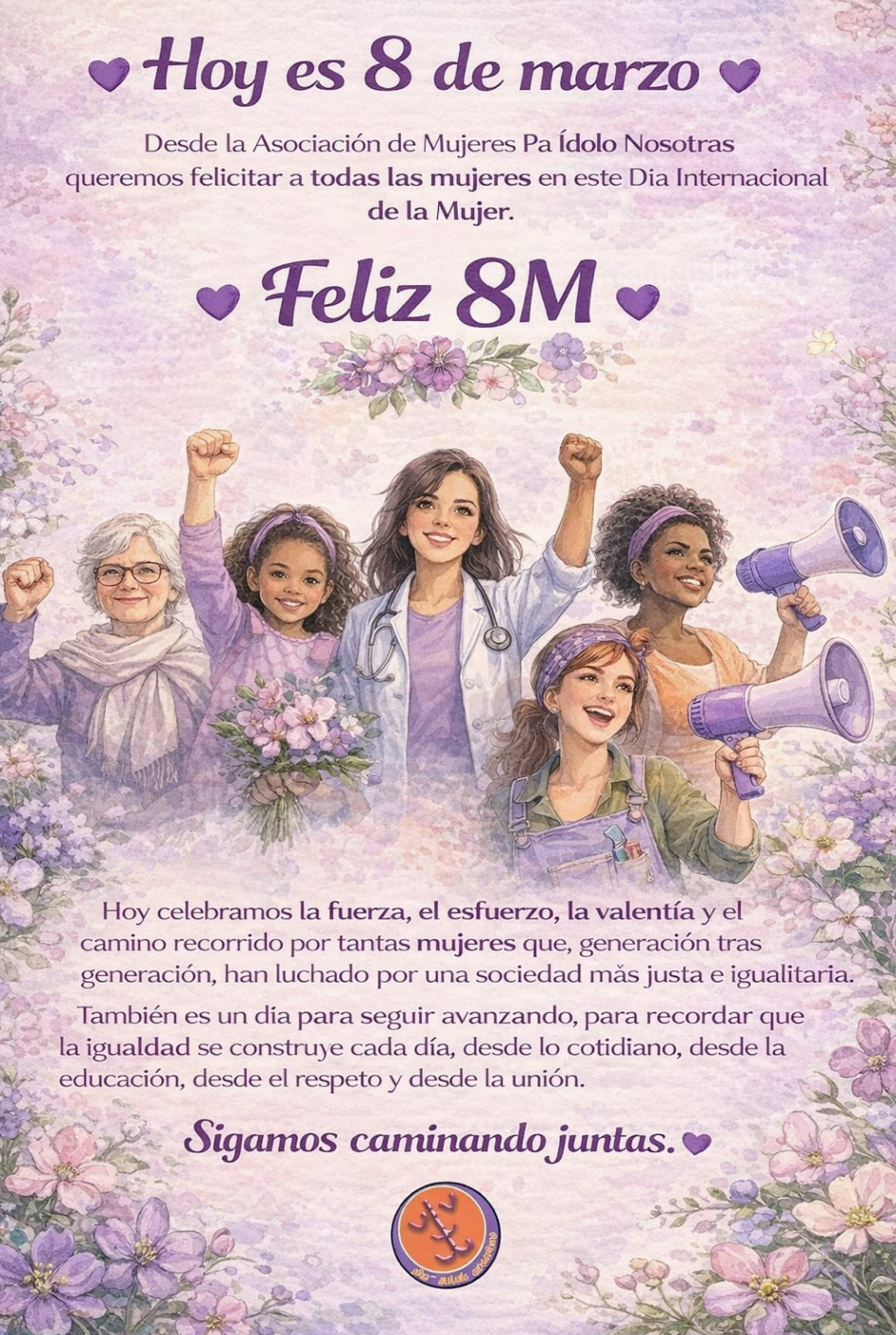 La Asociación de Mujeres “Pa Ídolo Nosotras”, ha organizado a lo largo de esta semana un buen número de actos con motivo de celebrarse, este domingo, 8 de marzo, el Día Internacional de la Mujer. Actos que comenzaron el pasado martes con un taller intergeneracional y concursos de cartas, lecturas violetas el jueves, taller de floristería, tertulia y labores el viernes, bailar la vida sin olvidar el aperitivo y, para hoy, día 8, hacer realidad el slogan, “Colgamos los Mandiles”, con la lectura de este manifiesto que ha corrido a cargo de María Victoria Gómez Muriel: hoy hemos puesto el broche final a la programación organizada por la Asociación de Mujeres Pa Ídolo Nosotras con motivo del Día Internacional de la Mujer.
