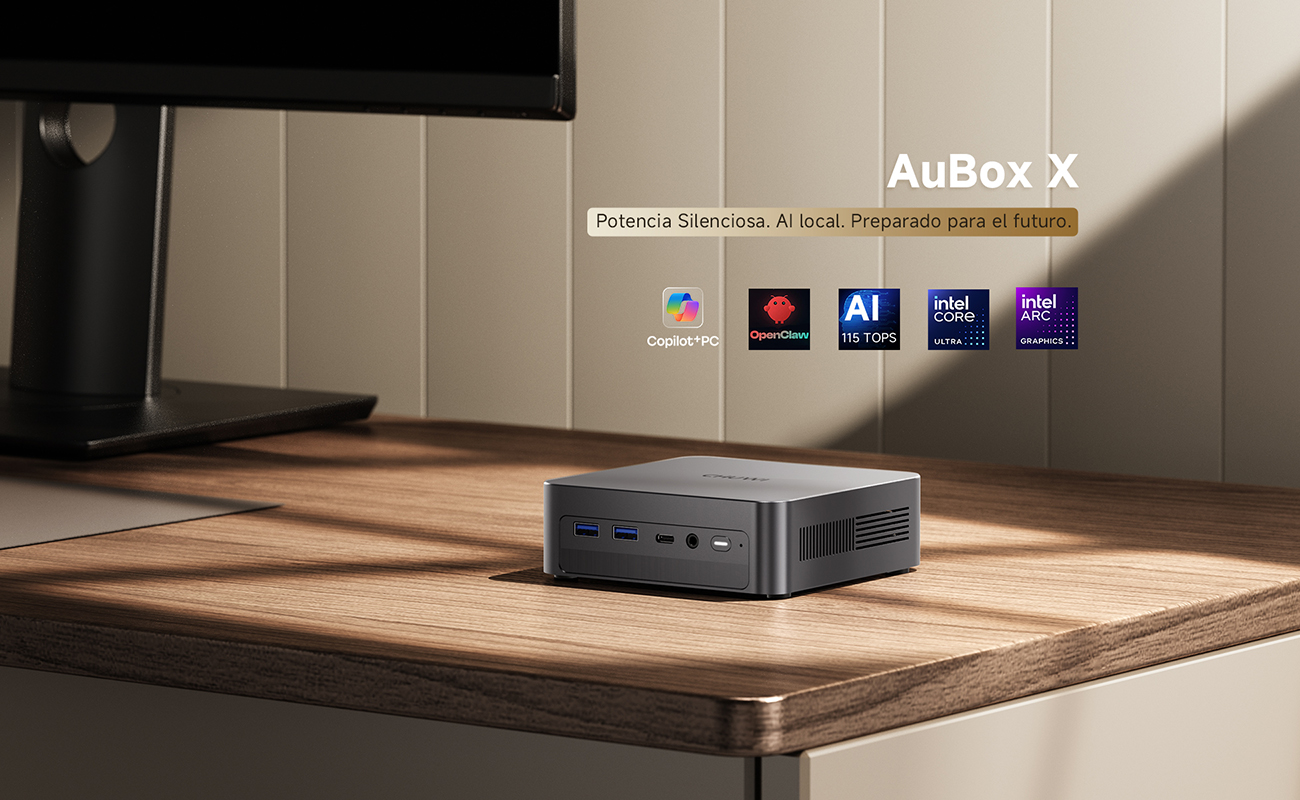 La compañía sitúa este modelo en la nueva generación de “PC con IA”, con aceleración local para tareas como mejora de fotos, eliminación de fondos en tiempo real y otras funciones asistidas por inteligencia artificial que se ejecutan directamente en el dispositivo. Según la nota, el AuBox X puede alcanzar hasta 115 TOPS en el modelo Ultra 7 y 97 TOPS en el Ultra 5, combinando CPU, GPU y NPU.