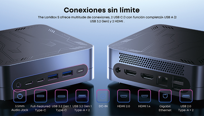 LarkBox S está equipado con una variedad de opciones de conectividad, incluidos dos puertos USB-C, cuatro puertos USB-A, dos puertos HDMI y un conector de audio de 3,5 mm, lo que la hace perfecto para futuras actualizaciones y una multitarea sin problemas.