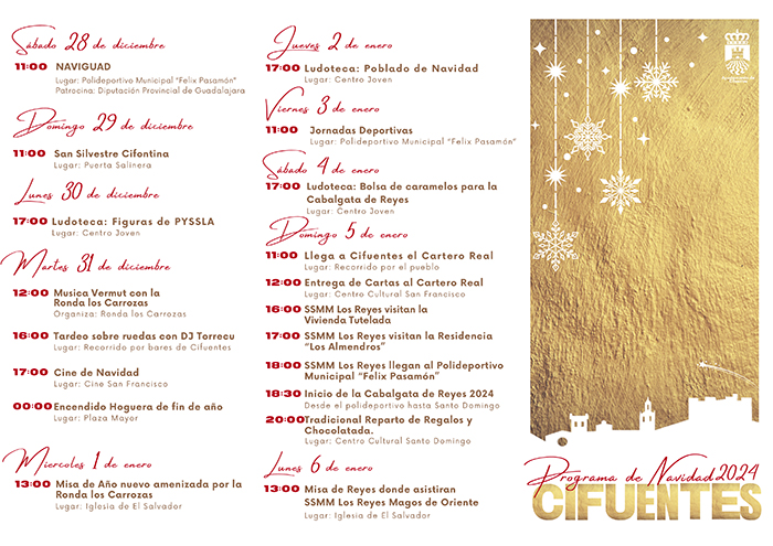 El cartel del Programa de Navidad de Cifuentes 2024 destaca por la predominancia del color oro, un tono que evoca la calidez y la luz de las fiestas navideñas, simbolizando la prosperidad y la esperanza que estas fechas traen consigo.