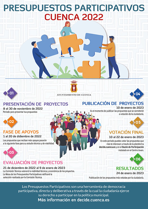 El proceso de los Presupuestos Participativos 2022 arranca hoy, martes 8 de noviembre, con la apertura del plazo para la presentación de propuestas, que se extiende hasta el día 30 de noviembre. Ésta deberá hacerse a través de la web http://decide.cuenca.es, página en la que está toda la información sobre el proceso, teniendo en cuenta que el Centro Joven cuenta con personal habilitado para ayudar a aquellas personas que lo necesiten.