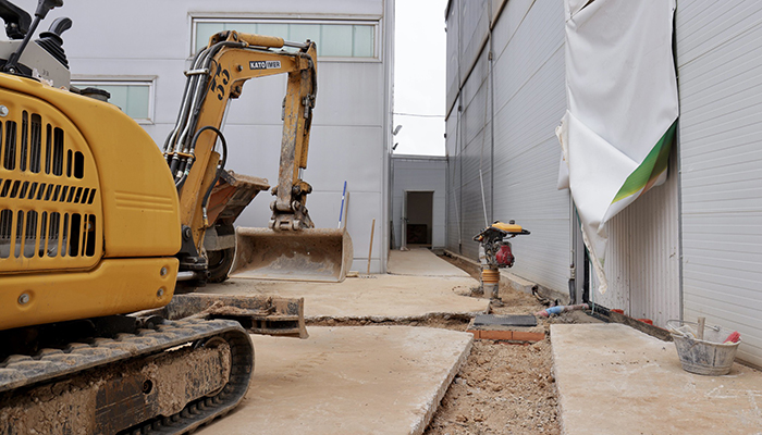 A continuación, se colocarán canaletas de drenaje superficial en la línea de entrada de las dos puertas de la carpa, y en el pasillo donde se produce la acumulación, conectándolas al nuevo colector que se va a construir.