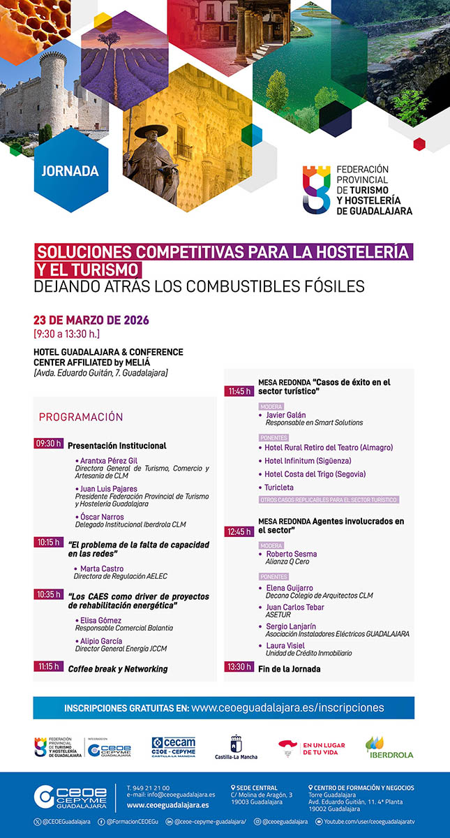El evento también servirá para conocer experiencias reales de ahorro energético. En una mesa redonda se expondrán los casos de éxito del hotel Infinitum de Sigüenza, junto a otros negocios nacionales como el Retiro del Teatro de Almagro, el hotel Costa del Trigo de Segovia y Turicleta. Una segunda mesa abordará la visión de los agentes implicados, con la decana de Arquitectos de Castilla-La Mancha, Elena Guijarro, y representantes de ASETUR, la Asociación Provincial de Instaladores Eléctricos de Guadalajara (ASIETGU) y entidades de crédito. La asistencia es gratuita previa inscripción en la web de CEOE Guadalajara.