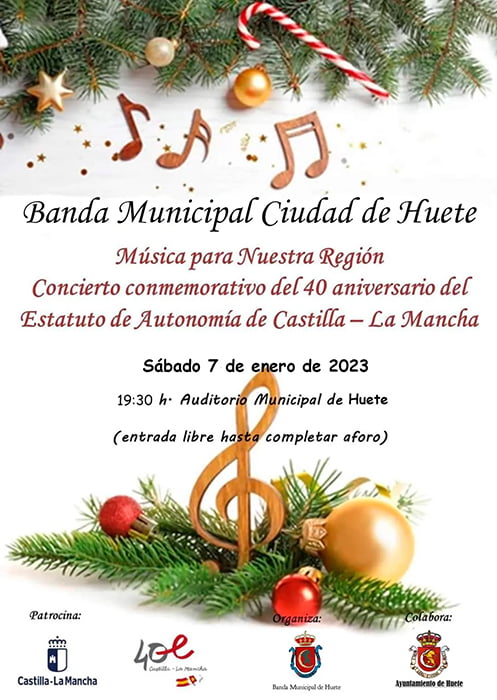 El próximo sábado 7 de enero de 2023 tendrá lugar el concierto conmemorativo del 40º aniversario del Estatuto de Autonomía de Castilla La Mancha a cargo de la Banda Municipal Ciudad de Huete. Comenzará a las 19:30 horas en el Salón de Actos del Ayuntamiento (teleclub).