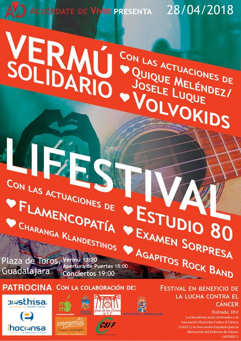 La Asociación Acuérdate de Vivir ha organizado para el próximo sábado 28 de abril el festival solidario LIFESTIVAL con las actuaciones de varios grupos de Guadalajara y con el objetivo de recaudar fondos para la investigación de la lucha contra el cáncer. La cita musical y solidaria tendrá lugar a partir de las 19:00 horas (con apertura de puertas a las 18:00 horas) en la Plaza de Toros de Guadalajara y cuenta con la colaboración del Ayuntamiento de la capital, la Diputación Provincial, la UTE Coso de las Cruces, el sindicato CSI-F, y las empresas Imprentis, Manzana Mordida y Jesthisa – Hocensa.