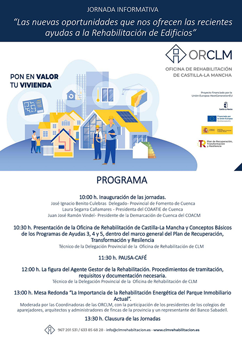 En esta jornada se presentarán las Oficinas de Rehabilitación de Castilla la Mancha, los conceptos básicos de las Ayudas a la Rehabilitación, la figura del Agente Gestor de Rehabilitación y cerrará con una mesa redonda donde se tratará La importancia de la rehabilitación energética del parque inmobiliario actual.