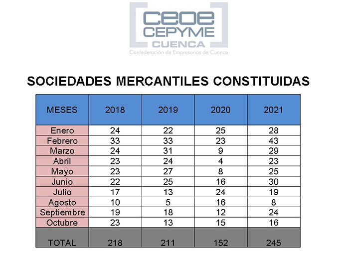 De enero a octubre de 2021 se han constituido en la provincia 245 sociedades mercantiles por las 152 de este mismo período del año pasado, lo que supone un incremento de 93 más, un crecimiento porcentual del 67,18%.