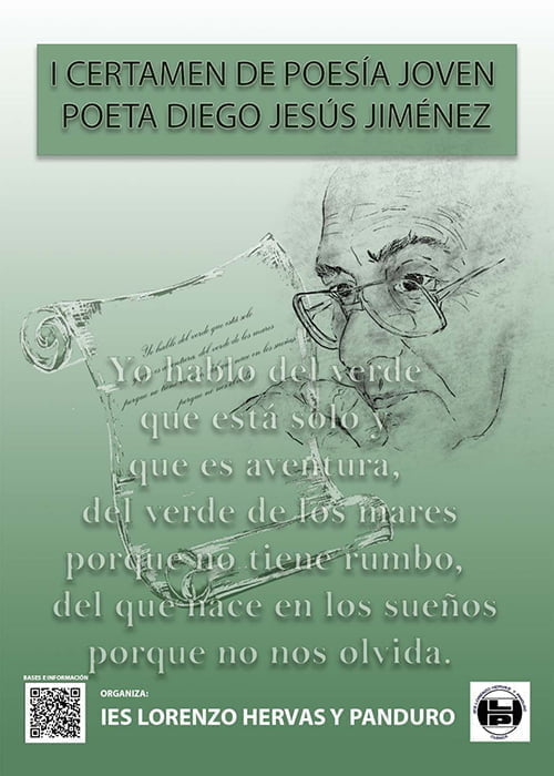 Se ha convocado en el IES Lorenzo Hervás y Panduro el I Certamen de poesía Diego Jesús Jiménez con el doble objetivo de dar a conocer la obra y la figura de uno de los escritores líricos más relevantes de nuestra provincia en el S.XX y de fomentar la creatividad artística de los alumnos de todos los centros de secundaria de la ciudad. Se han establecido dos modalidades cuyos ganadores recibirán premios (de 1º a 4º de Eso y los dos cursos de bachillerato). El plazo de recepción de los originales está abierto desde mediados de abril y termina el día 27 de mayo. El resto de las bases pueden consultarse en el código QR presente en el cartel adjunto o pinchando en el siguiente enlace.