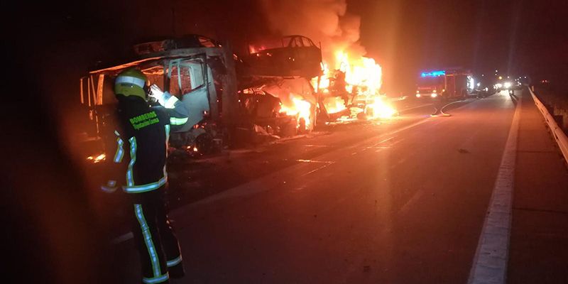 El camión transportador de vehículos ha salido ardiendo con tres turismos y una autocaravana quedando calcinados todos los vehículos.
