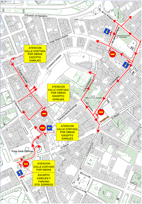 – El acceso a la Travesía de Santo Domingo desde la C/ Pareja Serrada queda restringido a los accesos a garajes. El resto de los vehículos que accedan por C/ Pareja Serrada podrán salir por la C/ sor Patrocinio y por la C/ Barrionuevo.