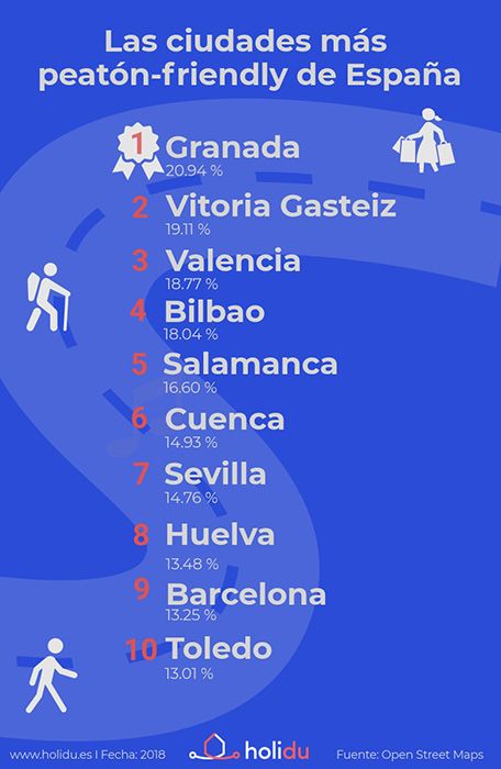El verano se aproxima, invitándonos a salir de nuestras guaridas invernales y aprovechar que las temperaturas se van volviendo más agradables para hacer viajes cortos, conocer nuevas ciudades y hacer un poco de turismo. Caminar por una ciudad hace que un sentimiento de pertenencia inunde a cualquier visitante, sumergiéndonos en la cultura del lugar, viendo a sus habitantes, descubriendo la ciudad con todos los sentidos. Las zonas peatonales conforman el centro neurálgico de la vidilla de cualquier ciudad: tiendas, cafeterías, el ir y venir de turistas y locales… no hay mejores zonas para sentarse a observar y llegar a conocer la esencia propia del lugar. Pero ¿qué ciudades disponen de la mayor zona peatonal? Holidu, el buscador de alquileres vacacionales y apartamentos, ha realizado un estudio para averiguarlo y presenta las ciudades con un porcentaje de zonas peatonales más alto como porcentaje entre el total de kilómetros de calles peatonales y el total de kilómetros de calles.
