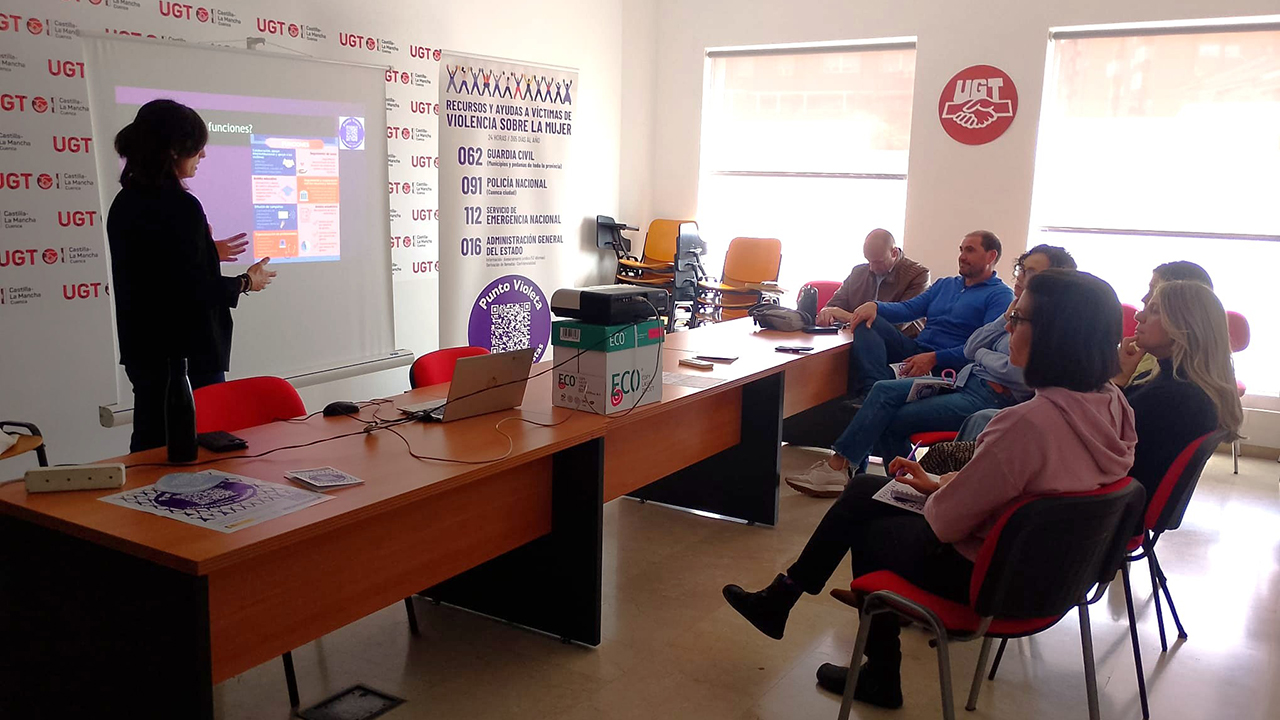 La Subdelegación del Gobierno en Cuenca ha impartido la formación en el sindicato Unión General de Trabajadores (UGT) para constituir la sede de la capital en Punto Violeta. Además de la capacitación, realizada a petición del sindicato, se ha hecho entrega de diferentes materiales como la pegatina-distintivo de Punto Violeta que debe de colocarse en sitio visible, o la Guía Punto Violeta para actuar frente a la Violencia Machista con información, por ejemplo, sobre cómo reaccionar ante un caso de tu entorno.