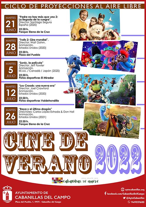 Un año más, las proyecciones de «Cine de verano» vuelven a Cabanillas del Campo de la mano del Ayuntamiento. Para este nuevo ciclo estival se han programado cinco sesiones con proyecciones al aire libre, que serán los martes a las 22:30 h., comenzando el 21 de junio, y hasta el 26 de julio (la excepción será el martes 19 de julio, en el que no habrá proyección por ser el día de inicio de las Fiestas de verano).