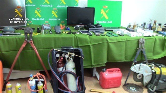 En los registros practicados se han intervenido una lanza térmica, 3 sopletes, 4 bombonas de oxígeno más acetileno, 1 inhibidor de frecuencia, una radial de gasolina, un escopeta que había sido sustraída en el año 2014, cartuchería, dos armas simuladas, 2 centralitas para la apertura de vehículos, 2 ganzuas de llave maestra, 5 extractores de bombines, una gorra oficial de la Guardia Civil, una defensa personal, diverso material audiovisual, numerosas herramientas usadas para cometer los delitos, 7.000 euros, gran cantidad de perfumes y productos cosméticos, 16 décimos de Lotería Nacional procedentes de un robos, especialmente el cometido en una Administración de Lotería de Burjasot (Valencia), por valor de 500.000 euros, mandos de garaje, entre otros.