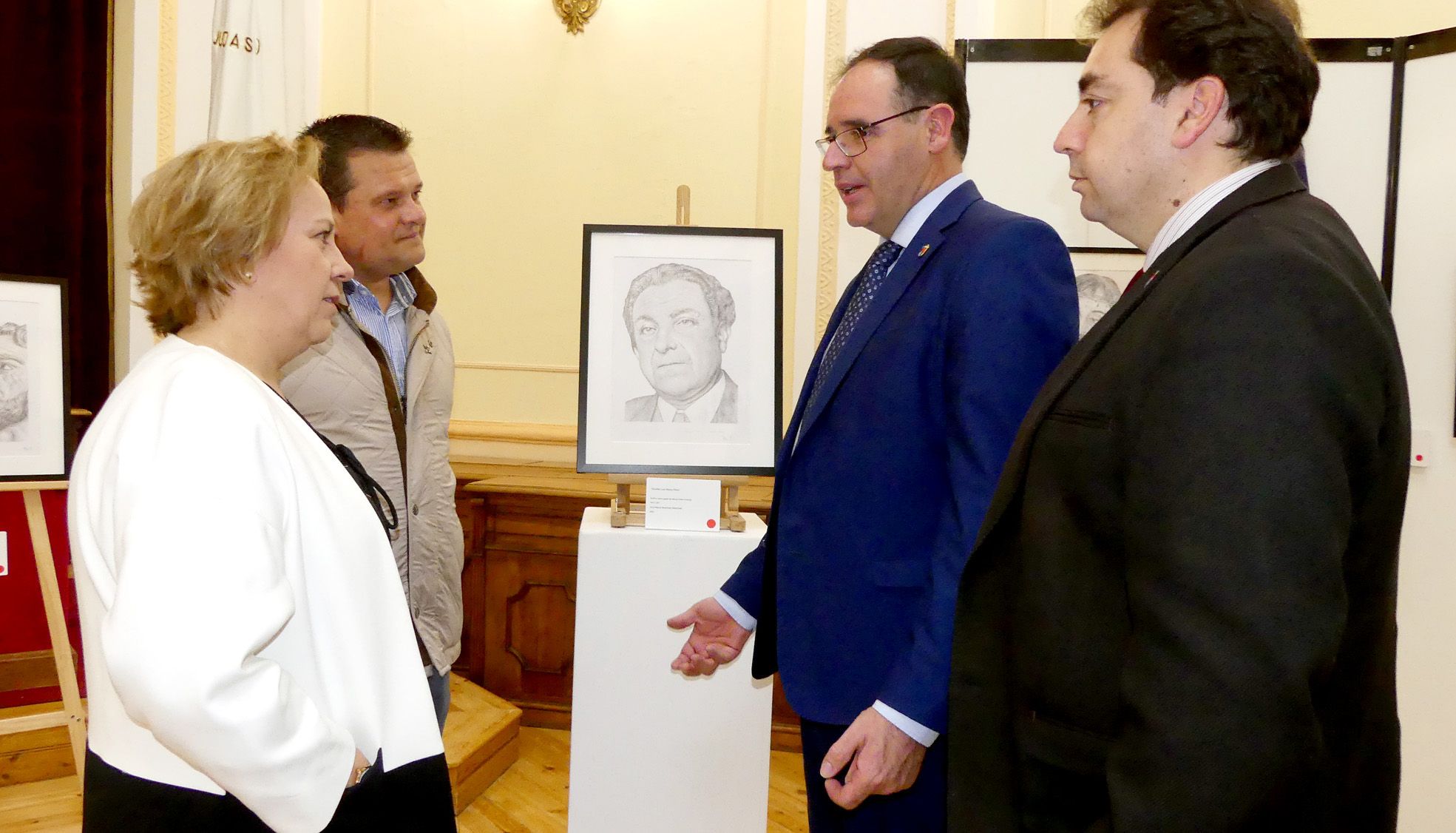 ‘Los gestos de nuestra Semana Santa’ es el nombre elegido por la Venerable Hermandad del Prendimiento de Jesús (Beso de Judas) de la capital para la exposición benéfica, que ha instalado en el Salón de Actos del Palacio Provincial y que este jueves abría sus puertas al público. Momento que no ha querido perderse el presidente de la Diputación, Benjamín Prieto, que, junto al diputado de Cultura, Francisco Javier Doménech, ha estado acompañado del secretario de la Hermandad, Ignacio Monleón; el presidente de la Asociación Vívere, Raúl Molina; y, como no, de la propia artista e integrante de esta cofradía, Ana Martínez Martínez.
