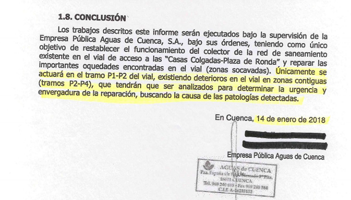 Asimismo, en enero de 2018, esta misma Concejalía remitió al Consorcio un informe de la empresa pública ‘Aguas de Cuenca’ donde se advierte que durante las obras de sustitución del colector de saneamiento en la subida a las Casas Colgadas de Cuenca y reparación del socavón  de la calzada “se ha detectado una importante oquedad bajo la solera del vial que no garantiza la estabilidad de zonas adyacentes a la zona aperturada, procediendo a la paralización de la obra”; al tiempo que se sugiere la realización de estudios “para conocer el origen de ese hundimiento”.