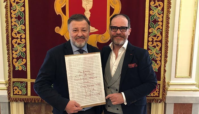 El alcalde Darío Dolz ha recibido de manos del compositor castellano-manchego José Zárate y Rodríguez de Gaspar una hoja del manuscrito original de la obra sinfónico-coral ‘Canto a Castilla-La Mancha’, compuesta con motivo del 40 Aniversario del Estatuto de Castilla-La Mancha.