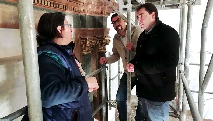 El diputado ha podido conocer de primera mano los detalles de la intervención, de la mano de Ángeles Comba, de Da Vinci Restauro, que le ha explicado que hasta el momento ya se han llevado a cabo los estudios previos, el montaje del andamiaje y el desmontaje del retablo, centrándose en la actualidad las labores en la limpieza y eliminación de repintados de la mazonería. Trabajos que, con posterioridad, darán paso a las tareas de estucado, reintegración y construcción de nuevos elementos, así como la recuperación de los dos lienzos de la calle central del retablo: uno dedicado a San Martín partiendo su capa y otro, en el ático, a la Inmaculada Concepción; dos óleos sobre tela clavada sobre tabla y marcos lisos dorados.