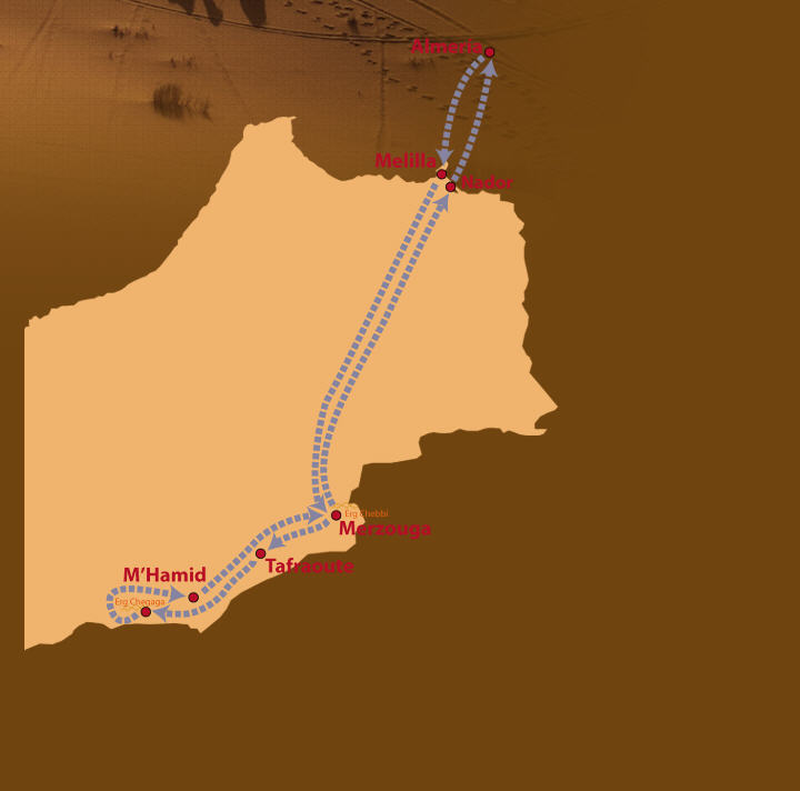 Impresiona entrar en Nador y encontrarte en otro mundo, en otro mundo. El tráfico es un poco caótico, la ciudad tiene una estructura lineal, a lo largo de la costa, los niños corren y cruzan la carretera por donde quieren… bueno, es Marruecos y aquí, en Nador, la calle huele a pollo frito o algo así. A carne de cordero a la brasa así que, vamos a descansar, a cenar y, mañana, será otro día, comenta Manuel Sanz pensando ya en el viaje que les llevará al desierto de Erg Chebbi, ubicado al sureste de Marruecos, en proximidad a la frontera con Argelia. La localidad que sirve como puerta de entrada a esta maravilla natural que es Merzouza, cuyo nombre también se utiliza para referirse a esta área conocida como el desierto de Merzouga.