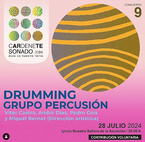 El Festival cARdeneTE SONADO 2024, ecos de nuestra tierra, presenta el próximo domingo 28 de julio su noveno concierto, ofrecido en esta ocasión por Drumming-Grupo de Percusión. La actuación cuenta con el apoyo de la Dirección General de las Artes del Ministerio de Cultura Portugués/DG Artes. Será a partir de las 20 horas en la Iglesia parroquial Ntra. Sra. de la Asunción de Cardenete, con contribución voluntaria.