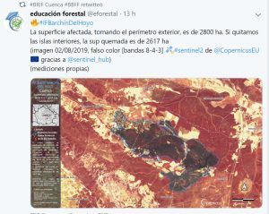 La Base BRIF del Prado de los Esquiladores, en su cuenta de Twitter, se hace eco de la información que, Educación Forestal, da sobre la superficie quemada en el incendio de Barchín del Hoyo. En ese sentido, esa fuente indica que, «tomando el perímetro exterior, la superficie quemada es de 2.800 ha. Si quitamos las islas interiores, la superficie quemada es de 2.617 ha».