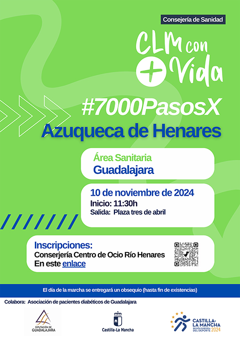 Para el domingo día 10 de noviembre, se ha programado en Azuqueca de Henares una edición de la Marcha 7000PasosX, una iniciativa de la Consejería de Sanidad de Castilla-La Mancha en colaboración con los ayuntamientos que tiene como objetivo fomentar el ejercicio físico y el ocio saludable entre la población.