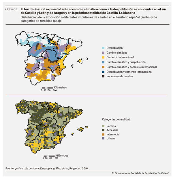 La superposición de los mapas sobre la prevalencia de la despoblación en España con los mapas de exposición al cambio climático (medido, por ejemplo, a través del riesgo de aridez) permite identificar regiones en las que existe una doble exposición.