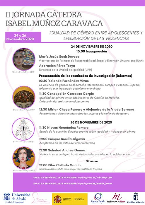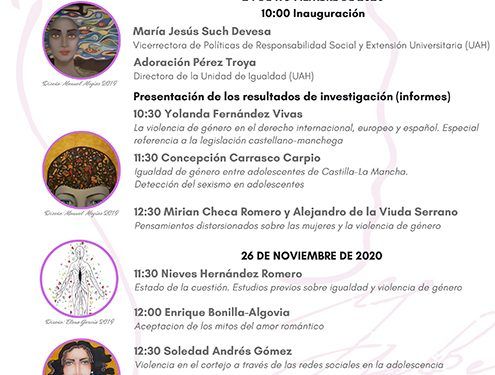 Ya el jueves 26, Nieves Hernández hará una evaluación sobre el ‘Estado de la cuestión. Estudios previos sobre igualdad y violencia de género’; Enrique Bonilla-Algovia tratará el tema de la ‘Aceptación de los mitos del amor romántico’ y Soledad Andrés hablará sobre la ‘Violencia en el cortejo a través de las redes sociales en la adolescencia’. Para finalizar, tendrá lugar la clausura del encuentro, a cargo de Pilar Callado, directora del Instituto de la Mujer de Castilla-La Mancha.