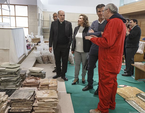 El alcalde de Guadalajara, Antonio Román, ha visitado hoy los trabajos de instalación del mosaico que decorará el altar de la parroquia El Salvador, de la capital; una obra del padre Marko Ivan Rupnik. Ha estado acompañado del vicario de la Diócesis Sigüenza – Guadalajara, Agustín Bujeda, y del párroco de El Salvador, Jesús Mercado.