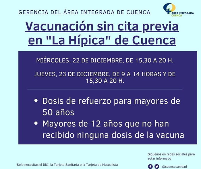 La vacuna contra el SARS-CoV2 se administrará esta misma tarde, de 15 a 20 horas; y mañana, día 23 de diciembre, de 9 a 14 horas y de 15,30 a 20 horas, en el recinto ferial de “La Hípica” de Cuenca.