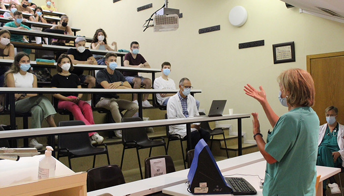 Durante esta jornada con la que comienza un curso de especial importancia para este alumnado, previo a su examen MIR, los distintos profesores han expuesto información útil para afrontar la formación práctica en aspectos tales como normativa interna, prevención de riesgos laborales o seguridad de pacientes y profesionales y también se ha informado a los estudiantes sobre las líneas fundamentales para las prácticas de cada una de las asignaturas y las particularidades de la rotación en prácticas en cada especialidad, además de las formas de valorar los conocimientos adquiridos.
