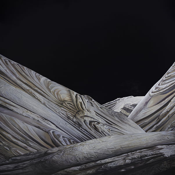 La serie pictórica “Negro cielo” se extiende sobre el perímetro de la sala como un horizonte fragmentado, generando la ilusión de un único paisaje. Los cuerpos yacentes de nuestra cultura devienen en territorio, su extraña horizontalidad sugiere accidentes geográficos, lugares que re-habitar de algún modo, a pesar de que ya o aún no existan.