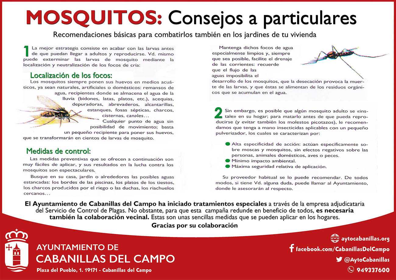 El Ayuntamiento de Cabanillas del Campo, a través de la empresa que tiene el contrato del servicio de control de plagas, ha comenzado en estos días a realizar los tratamientos preventivos contra la proliferación de mosquitos, una situación recurrente que llega cada año con la subida de las temperaturas, y que en esta temporada puede ser especialmente intensa, debido a las abundantísimas lluvias de las últimas semanas.