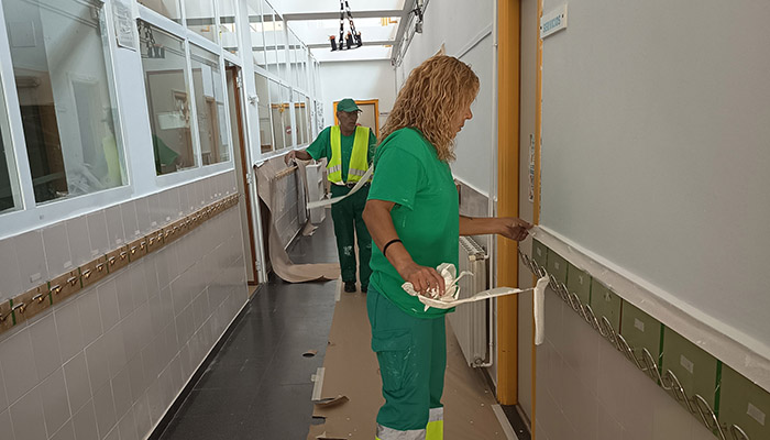 Aprovechando las presencia de los nuevos trabajadores y trabajadoras contratados con el Plan de Empleo de este año, que han reforzado el papel de las Brigadas Municipales, el consistorio ha destinado a estos operarios a realizar labores de pintura en aulas y pasillos que precisaban de un repaso, así como otro tipo de labores, como pequeñas operaciones de albañilería y rellenado de grietas, reposición de enchufes y azulejos, o arreglo de distintos elementos del mobiliario escolar, desde persianas y ventanas, hasta sillas y mesas.