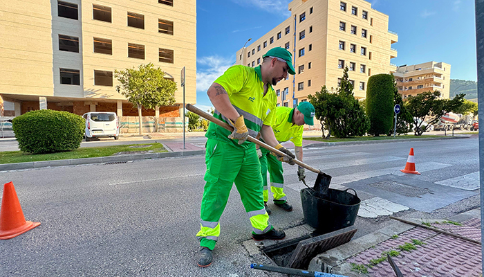 El servicio se ha reforzado con la contratación de 12 operarios que realizan trabajos de desbroces, soplados, barridos, limpieza de sumideros, retirada de cartelería, eliminación de pintadas y baldeo con agua a presión y jabón para la retirada de manchas, entre otros.