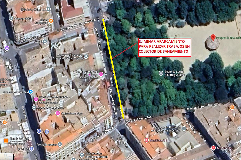 Esta intervención, dentro de las actuaciones de mantenimiento de estas infraestructuras que lleva a cabo el Consistorio conquense, implica la prohibición de aparcamiento en el tramo del Parque de San Julián entre las calles Alonso Chirino y Cardenal Gil de Albornoz para poder llevar a cabo los trabajos y no interferir demasiado en el tránsito de vehículos.