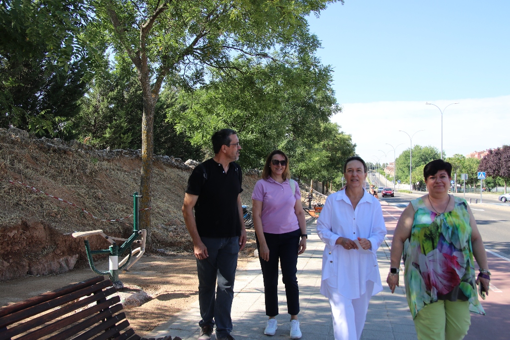 La alcaldesa de Guadalajara, Ana Guarinos ha visitado hoy los trabajos de adecuación de espacios que los operarios de albañilería y de jardinería contratados a través del Plan de Empleo, están realizando en la Avenida de Aragón, en la conocida popularmente como ‘ruta del colesterol’, donde se ha desbrozado toda la maleza y se está arreglando el talud, los desperfectos de las aceras y allanando cada zona de máquinas de ejercicio.