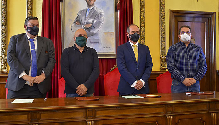 El alcalde de Guadalajara, Alberto Rojo, junto a los presidentes de las federaciones de Comercio, Ángel Escribano en representación de FEDECO-CEOE, y Miguel Villa, por FCG, han suscrito un convenio por el que se “inyectarán 40.000 € directos a la dinamización del comercio local” ha explicado Fernando Parlorio, concejal delegado de Comercio en el ayuntamiento de Guadalajara.
