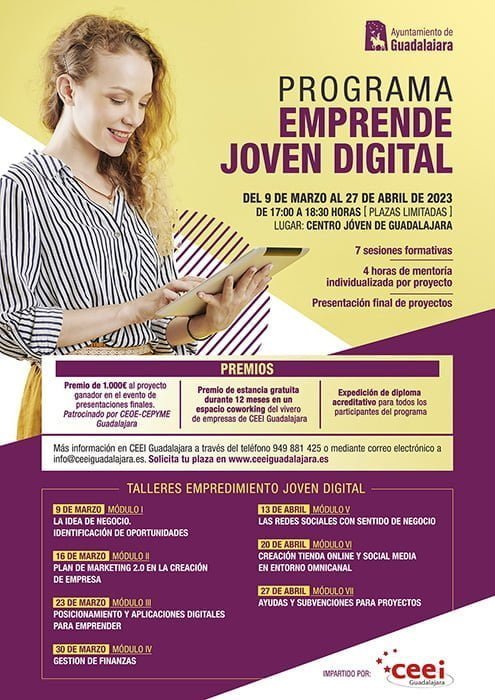 Se trata del programa ‘Emprende Joven Digital’, enfocado a personas de edades comprendidas entre 18 y 35 años, que impartirán profesionales del Centro Europeo de Empresas (CEEI) de Guadalajara, desde el próximo jueves, 9 de marzo, y hasta el 27 de abril.