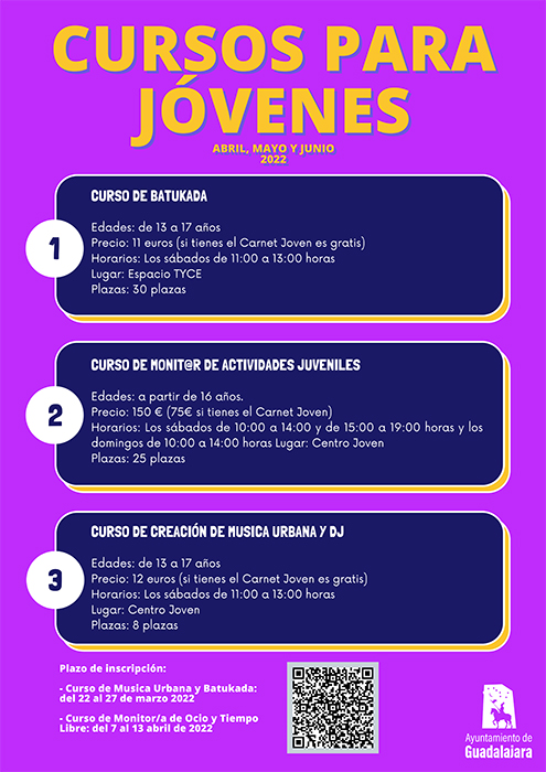 El plazo para inscribirse al de Batukada y Música Urbana comienza mañana, día 22 de marzo, y finalizará el 27; mientras que las personas interesadas en el de Monitor/a de Ocio y Tiempo Libre tendrán desde el 7 al 13 de abril para inscribirse. Las solicitudes se formalizan en el Centro Joven.